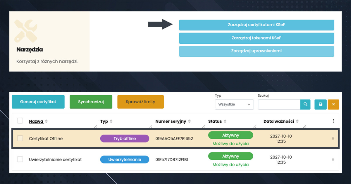 W mpFirma Online możesz także wygenerować certyfikat KSeF, czyli klucz techniczny pozwalający na automatyczne połączenie z systemem Ministerstwa Finansów – bez potrzeby logowania. Dzięki niemu faktury mogą być wysyłane do KSeF i odbierane z KSeF nawet wtedy, gdy nie jesteś zalogowany w aplikacji. Certyfikat przydaje się również przy wystawianiu faktur offline.