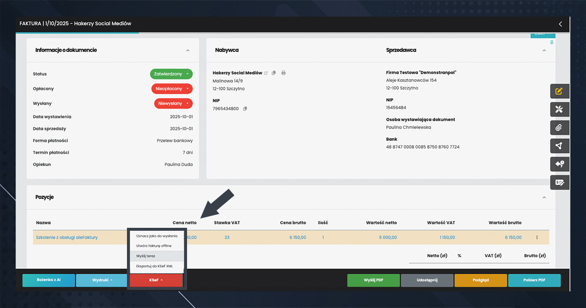 - KSeF → Wyślij teraz, a system zajmie się resztą.